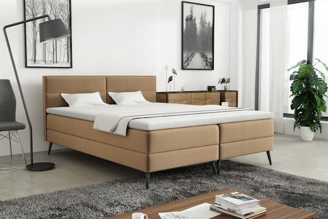 Boxspringbett Schlafzimmerbett MARKOS Stoff "Soro" in Beige 200x200cm inkl. 2 x Bettkasten ohne Kaltschaum Topper! Erhältlich auch mit Kaltschaum Topper! Boxspringbett / Polsterbett MARKOS mit aufklappbaren Bettkästen Das extravagante Boxspringbett MARKOS besticht durch das ausgefallene Design. Die Bettkästen sind gepolstert, was dem Boxspringbett Einzigartigkeit und Luxuriösität verleiht. Außerdem bietet das Boxspringbett ausreichend Stauraum für alltägliche und nicht alltägliche Dinge. Das eingebaute Liftsystem ermöglicht ein kinderleichtes Aufklappen der beiden Bettkästen. Besonderheiten: Matratzen Liegefläche mit Originalstoff bezogen (Farbe: Beige) Beidseitig aufklappbare Bettkästen Hochwertige Bonellfederkernmatratze mit orthopädischen Eigenschaften Widerstandsfähiger und angenehm zu berührender Stoff Gepolstertes Kopfteil und gepolsterte Bet...